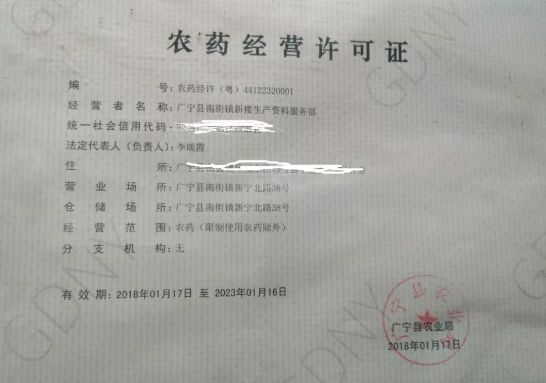 2018年1月18日,肇慶市廣寧縣農(nóng)業(yè)局審核通過(guò)了在政府網(wǎng)上辦事大廳申領(lǐng)農(nóng)藥經(jīng)營(yíng)許可證的申請(qǐng),在該局進(jìn)行了第一批農(nóng)藥經(jīng)營(yíng)許可證發(fā)證儀式,對(duì)符合農(nóng)藥經(jīng)營(yíng)條件的農(nóng)藥經(jīng)營(yíng)者發(fā)放許可證,為肇慶市頒發(fā)的第一個(gè)農(nóng)藥經(jīng)營(yíng)許可證。