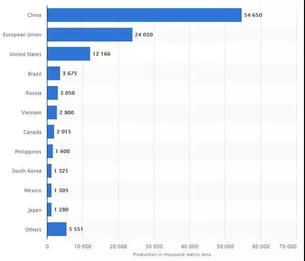 據(jù)估計每年全球海鮮消費總量1.44億噸,中國是最大的海鮮消費國,以6500萬噸占全球總量的45%,接下去是歐盟(1300萬噸)、日本(740萬噸)、美國(710萬噸)和印度(480萬噸)。