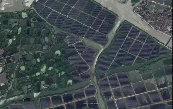從谷歌地圖上你可以看到,太陽能供電的魚塘已經(jīng)開始替代桑基魚塘。湖州的部分地區(qū)已經(jīng)裝上了太陽能電池板。
