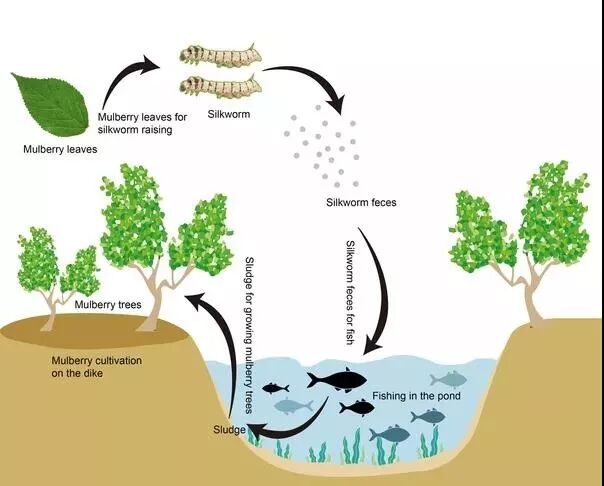 在完全不知道“可持續(xù)發(fā)展”這個概念的情況下,中國農(nóng)民利用這個魚-桑-蠶組成的生態(tài)系統(tǒng)已經(jīng)有幾千年歷史。如今,這個系統(tǒng)發(fā)展成對同一片土地的多次循環(huán)利用: