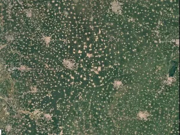 這聽起來有點嚇人,但實際上綠色的是農(nóng)田,白色的點是村莊,每個村大約500人。比較大的白色區(qū)域是鎮(zhèn),人口從1萬到10萬不等。