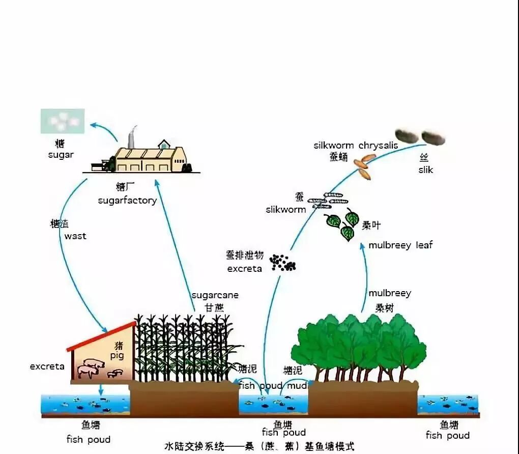 這些樹是桑樹,是用來養(yǎng)蠶的。兩千年來,這片地區(qū)的中國人發(fā)展出許多高度復雜且可持續(xù)的農(nóng)業(yè)生態(tài)系統(tǒng)。其中最著名的當屬桑基魚塘,見下圖: